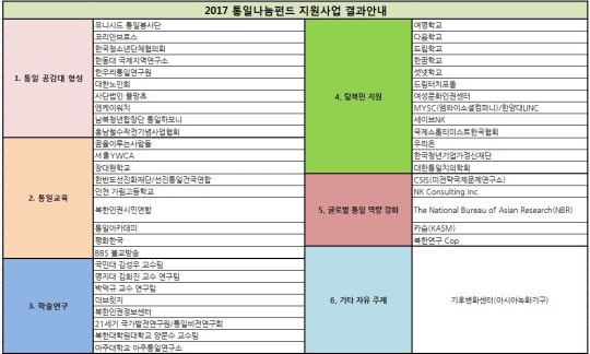 ▲ 2017년 통일과 나눔 펀드 지원사업 대상. 구체적인 사업 내용과 금액은 확인이 어렵다.